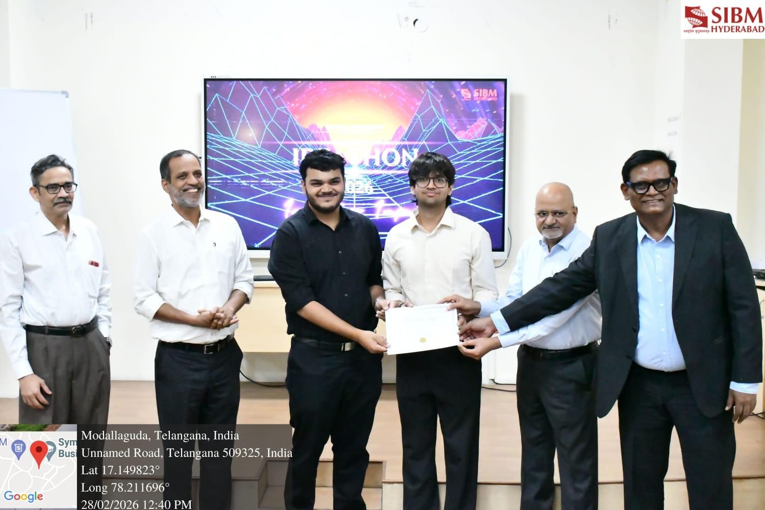 (Caption for Photo 2: Runner-Up Team – SCMS being felicitated during Ideathon 2026 at the Lecture Theatre, SIBM Hyderabad )